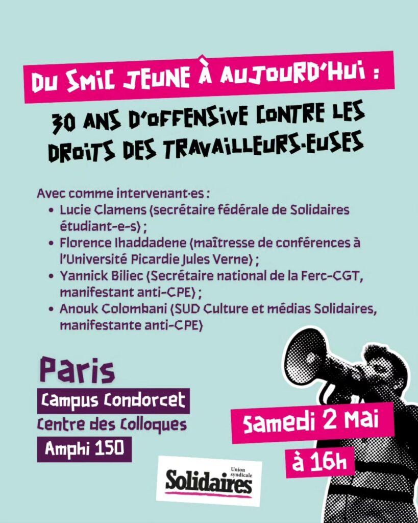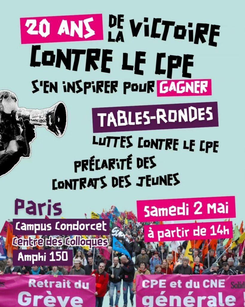 À l’occasion des 20 ans de la lutte victorieuse contre le Contrat Première Embauche, l’Union syndicale Solidaires organise le samedi 2 mai 2026 une rencontre autour de tables-rondes au campus Condorcet (centre des colloques, amphi 150).