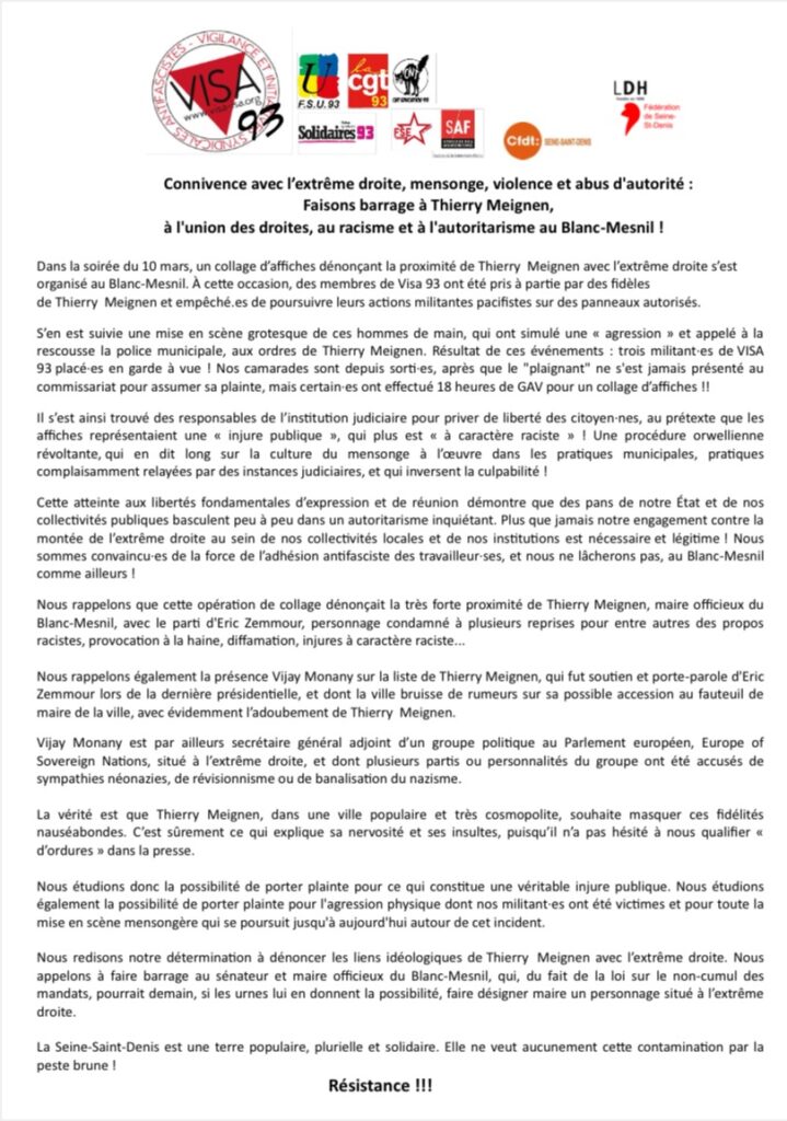 Dans la soirée du 10 mars, un collage d’affiches dénonçant la proximité de Thierry Meignen avec l’extrême droite s’est organisé au Blanc-Mesnil. À cette occasion, des membres de Visa 93 ont été pris à partie par des fidèles de Thierry Meignen et empêché.es de poursuivre leurs actions militantes pacifistes sur des panneaux autorisés.