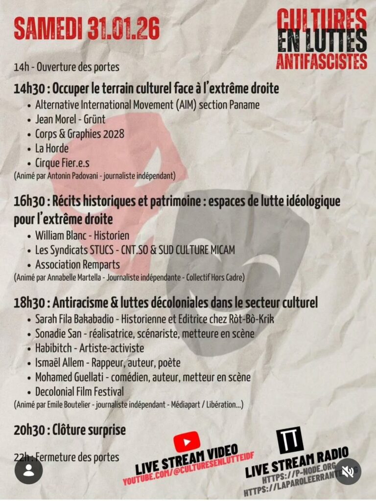 Cultures en luttes antifascistes 31 janvier 202622 janvier 2026UD 93 Quand 31 janvier 2026 - 1 février 2026 00:00 Ajouter au Calendrier Télécharger ICS Calendrier Google iCalendar Office 365 Outlook Live Où la Parole errante 9 Rue François Debergue, Montreuil, 93100 Type d’évènement Agenda Deux journées de rencontres, de tables-rondes et d’infokiosk Programme