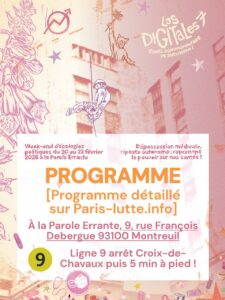 Du 20 au 22 février 2026, les Digitales reviennent pour la 7e édition de leur festival ! Week-end d’écologies politiques du 20 au 22 février à la Parole Errante. Dépossession médicale, riposte autonome : reprenons le pouvoir sur nos santés !