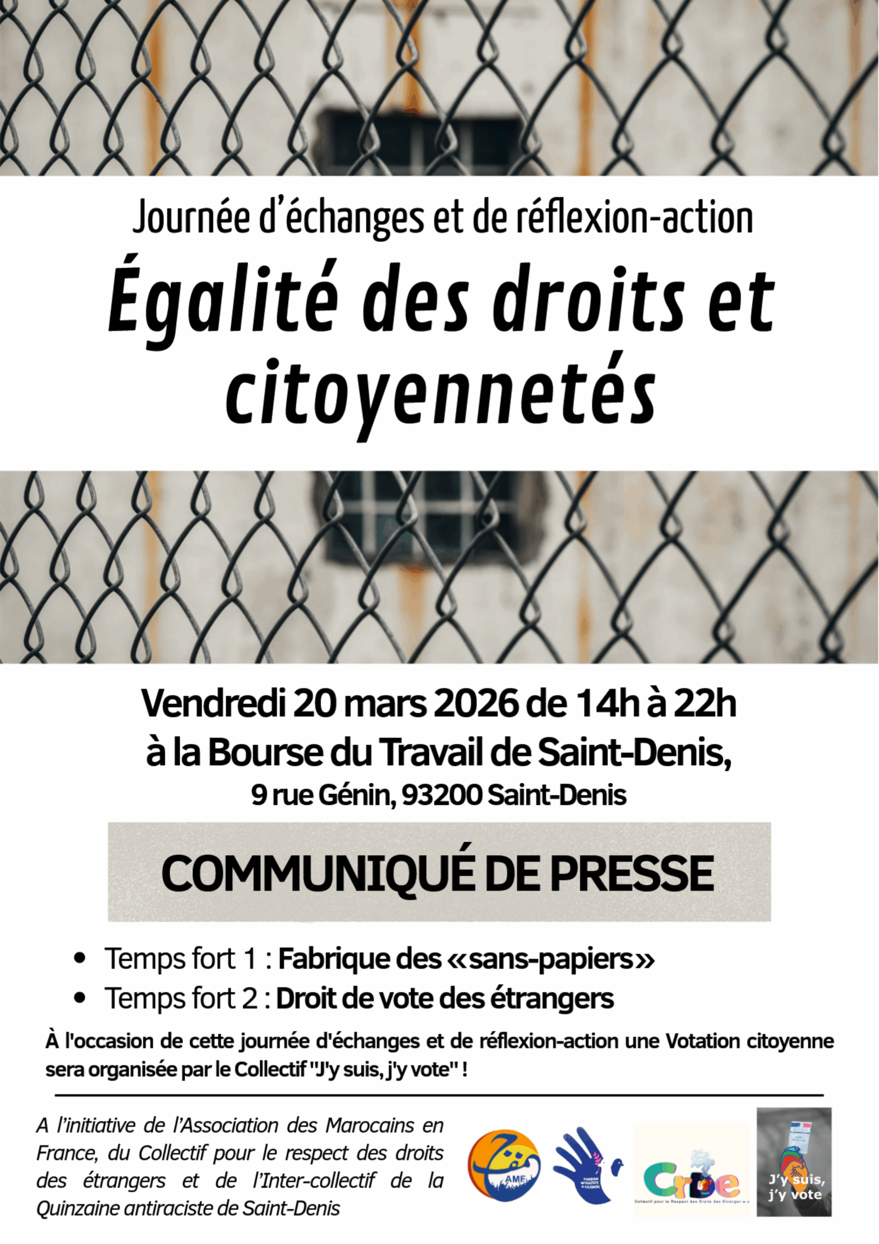 Le collectif pour le respect des droits des étranger⋅es de Saint-Denis vous invite à la bourse du Travail le vendredi 20 mars 2026 en collaboration avec l’AMF autour du sujet « la fabrique de sans papiers » :