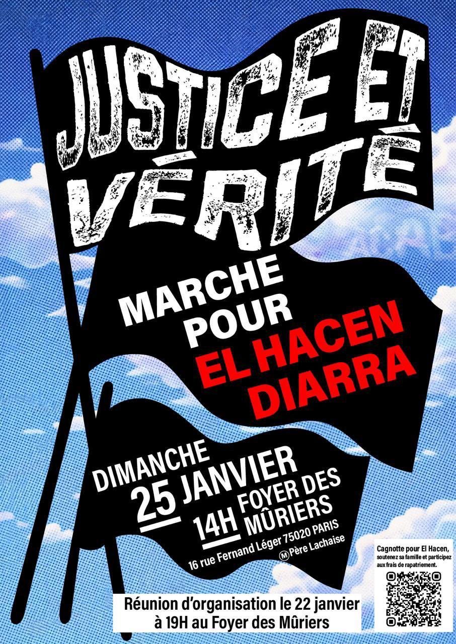 Marche pour El Hacen Diarra tué par la police 25 janvier 202622 janvier 2026UD 93 Quand 25 janvier 2026 14:00 Ajouter au Calendrier Télécharger ICS Calendrier Google iCalendar Office 365 Outlook Live Où Paris Paris, Paris Type d’évènement Agenda Mort d’El Hacen Diarra : l’Union syndicale Solidaires exige vérité et justice