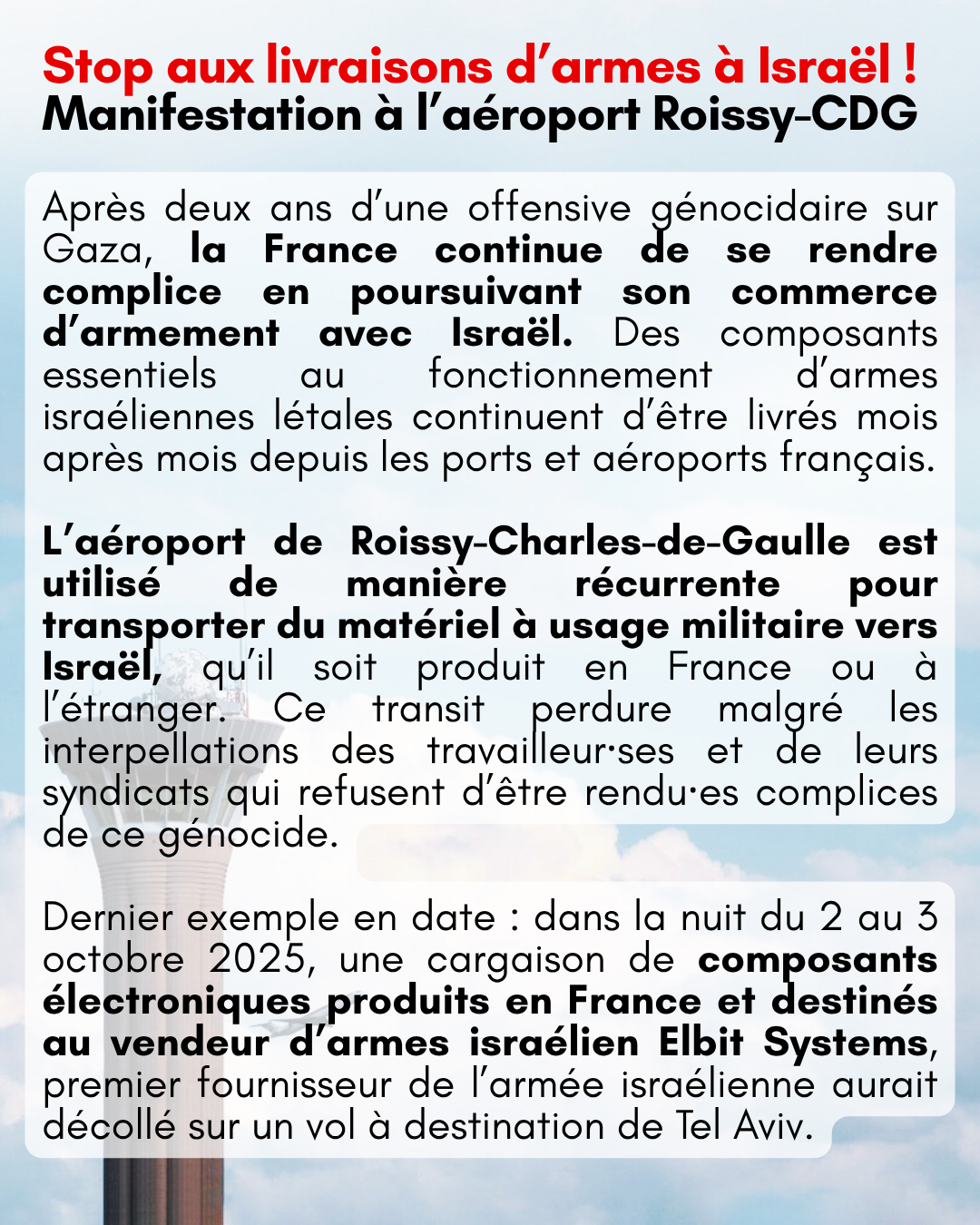 Stop aux livraisons d’armes à Israël ! Appel national à manifester le samedi 25 octobre 2025 à l’aéroport Roissy Charles-de-Gaulle