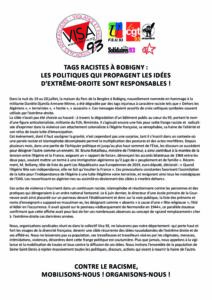Tags racistes à Bobigny : les politiques qui propagent les idées d’extrême-droite sont responsables !